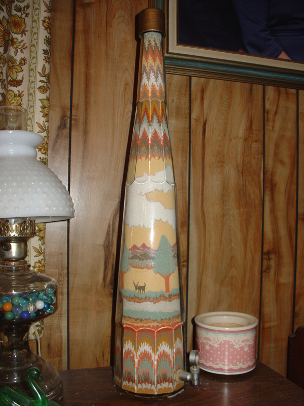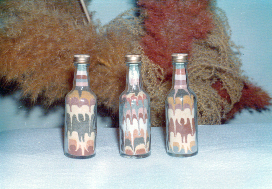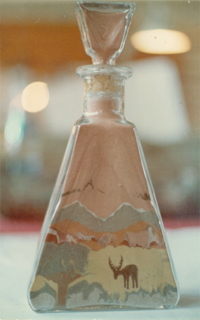 Sometime in 1969, Doyle and Lodena discover sand bottles. They pick up quickly on the craft. Their early sand bottles were somewhat simple in design, but still beautiful. Their earliest work seems to be just layers of different colored sands, followed later by adding in angels, and even later trees, deer, elephants, clouds, all kinds of things. Note in the picture above (don't know when it was taken) the angel design in the bottles. I don't know why the angel-era lasted such a short time. Perhaps he was never happy with the design? Notice in the top picture that they hadn't even started using the butter tins for the sand, but were using glass jars instead.
