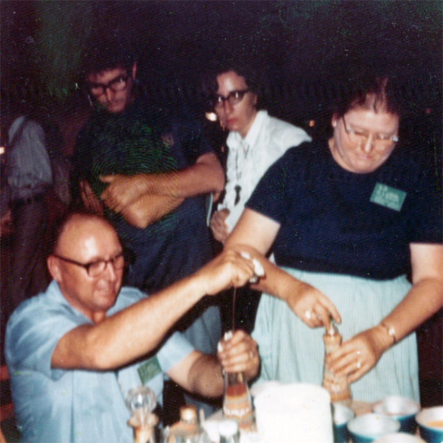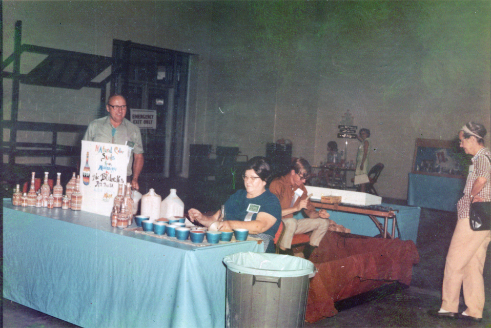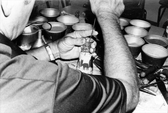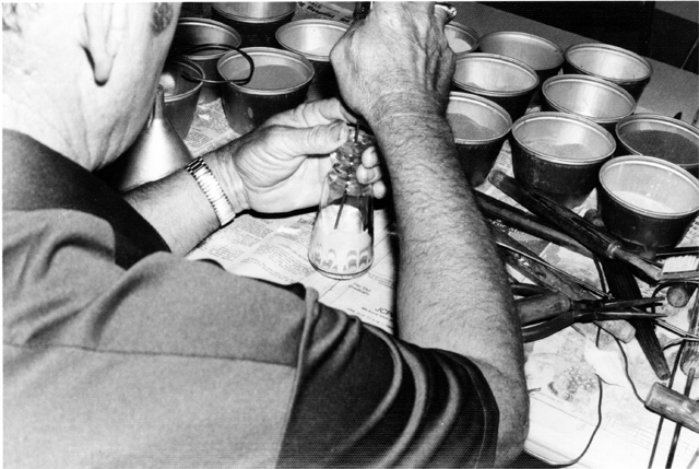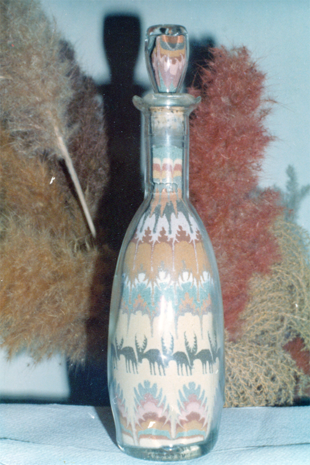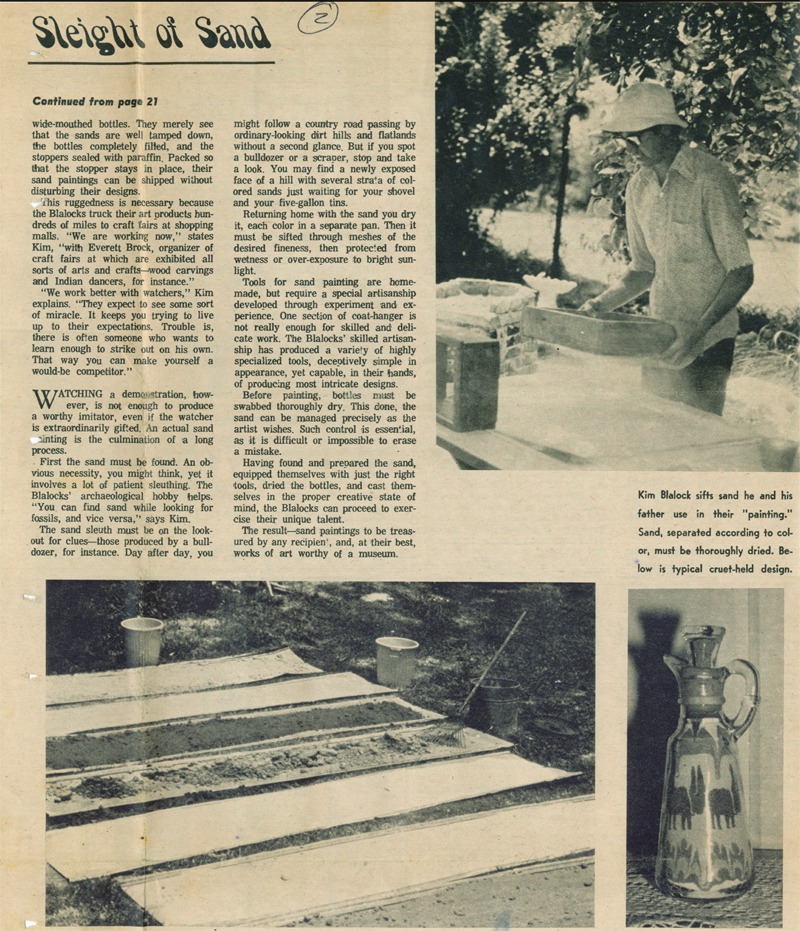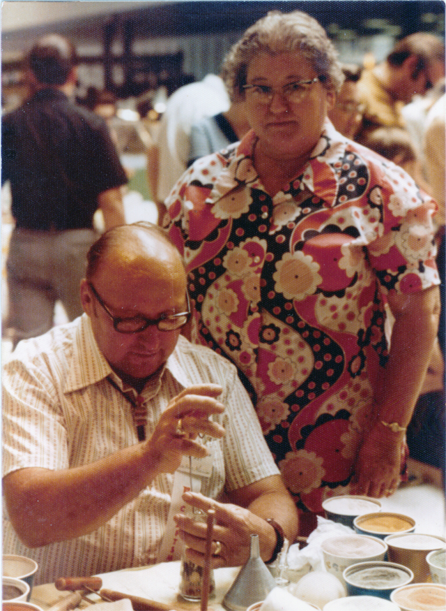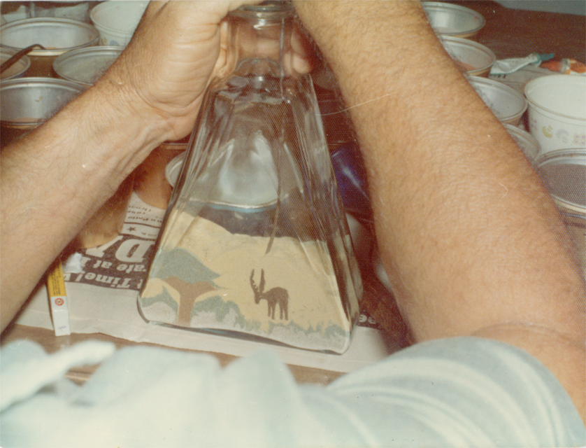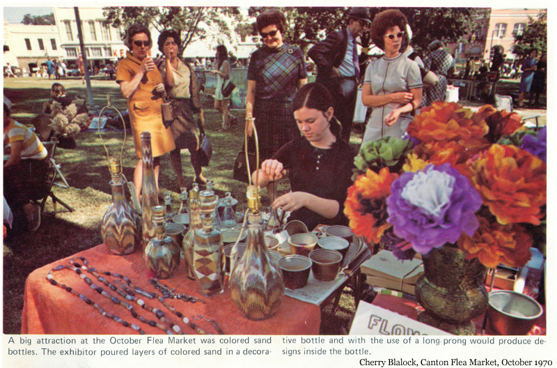 The whole family gets involved in making art from sand and glass bottles. That's a picture of my mother, Cherry, working at the Canton Flea Market in 1970.