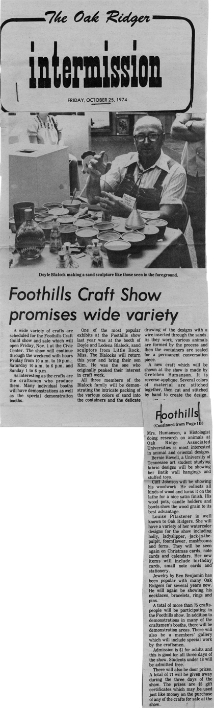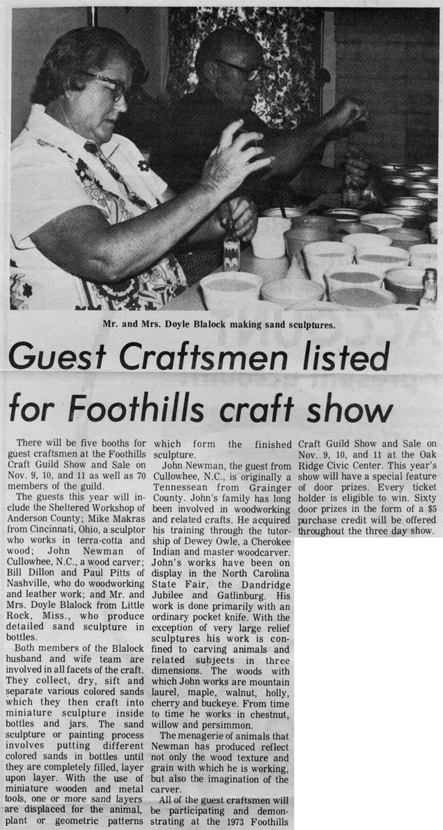 In November of 1973, Doyle and Lodena are guest craftsmen for the Foothills Craft Guild Show and Sale in Oak Ridge, TN. This organization still exists today.
