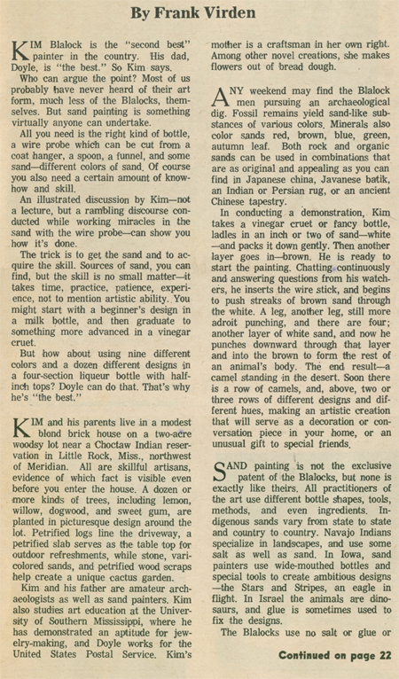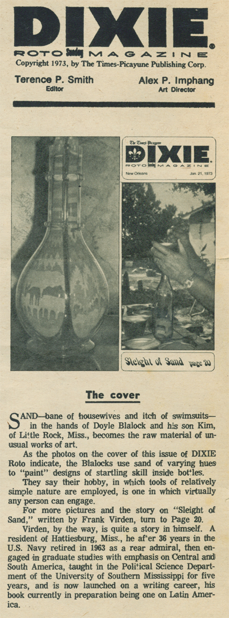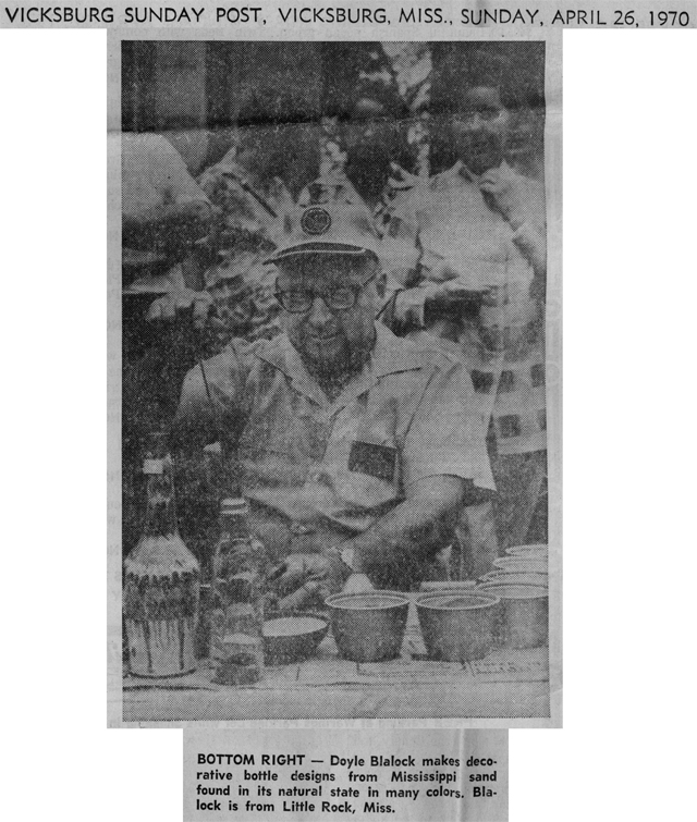 Apparently he had a table at the 1970 Vicksburg flea market. The paper this article was printed on was in very bad shape, but take notice of the bottles he had just finished. He still has a long way to go on practicing!