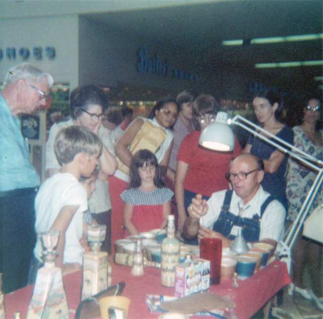 In early December of 1970, Doyle and Lodena display their sand bottle work at Sears department store in Meridian, MS.