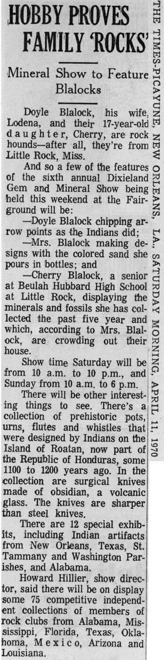 On April 11-12, 1970, the Blalocks are working in New Orleans at the 6th annual Dixeland Gem and Mineral Show.