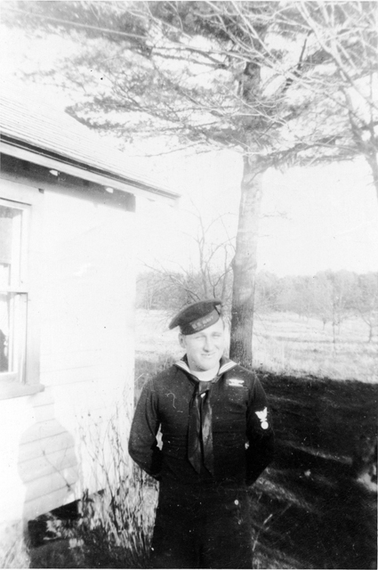 Notice in the pictures above - 1) the dolphins on his right sleeve between his wrist and elbow 2) the electrician's mate (rate), 3rd class (rank, one red stripe) patch on his left sleeve 3) the Submarine Combat Insignia on his upper-left chest. The woman in the picture that is hugging him isn't my grandmother. The back of the picture said "Hazel Dixon Wells" but I've never heard of her.