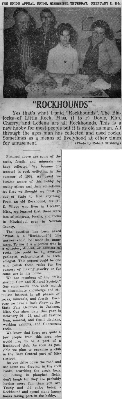 On February 11, 1964, the Blalock family is featured in The Union Appeal newspaper as a family of rockhounds. They have been "into" rocks for only a couple of years, but this is only the beginning!