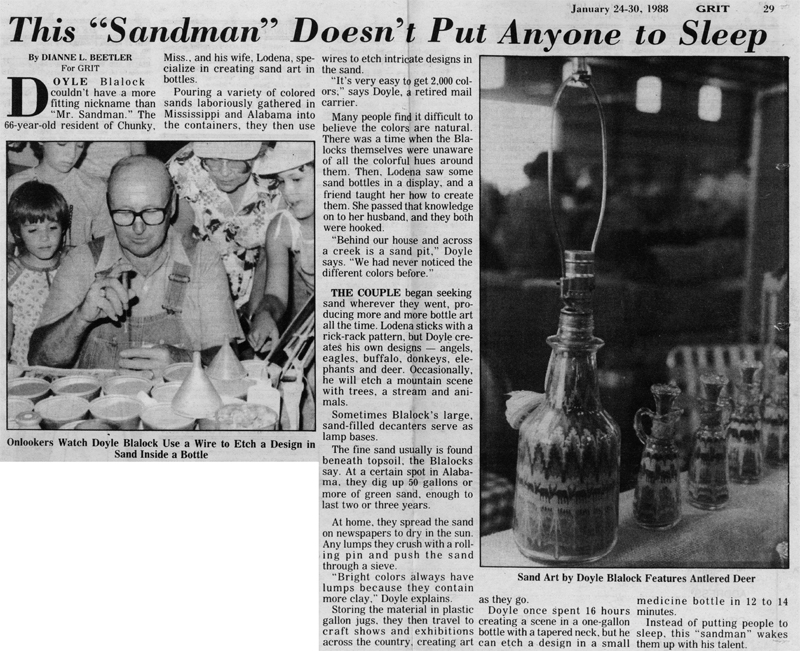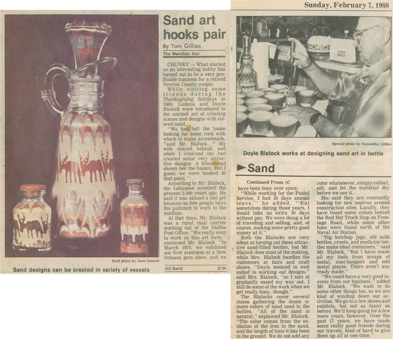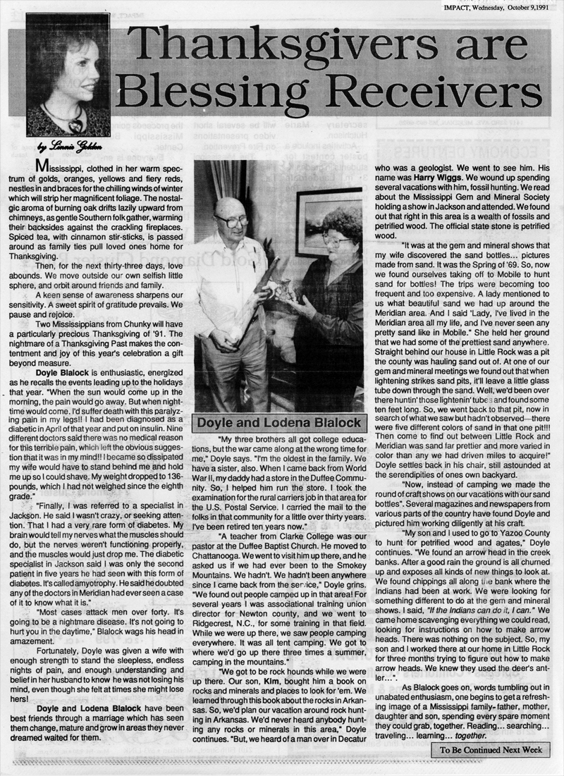 In October of 1991, Doyle and Lodena were featured in a two part article series in the IMPACT newspaper. These articles give a very good overview of their rockhounding/arrowhead making/sand bottle art times.