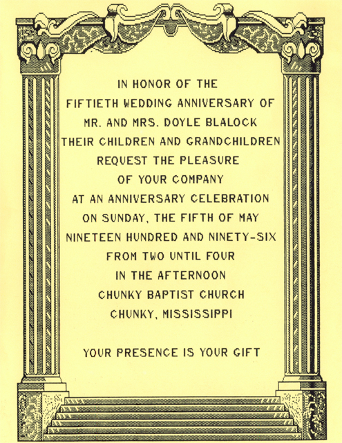 On May 8, 1996, Doyle and Lodena celebrated their 50th wedding anniversary. They had a large party at Chunky Baptist Church on Sunday, May 5, 1996 to honor it. I started college at Mississippi State University in the fall of 1996, and my brother Luke, who had been there for a few years already, was nearly finished.
