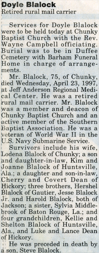 Doyle had struggled with the diabetes, diabetic amyotrophy, glaucoma, prostate cancer, and a valve replacement. In April of 1997, he had bad stomach pains and learned he needed gall bladder surgery. The last Sunday I saw him at church, he told me that he didn't want to have this upcoming surgery. He said he just knew that this was it for him, and he wouldn't make it out of this surgery. It kind of shook me, but I reassured him that everything would be fine, which is honestly what I expected. Sadly, on April 23, 1997, he did not make it out of that surgery. His heart couldn't take it. He was 75 years old.